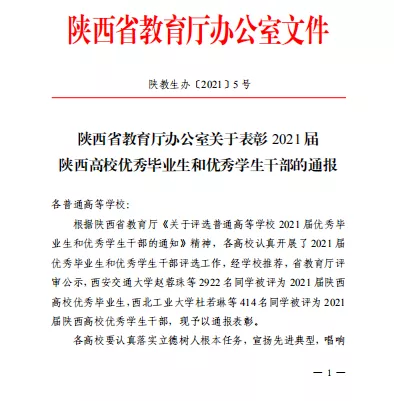近日,陕西省教育厅办公室发文表彰了2021届陕西高校优秀毕业生和优秀员工干部,公司环境艺术设计1801班的王文婷和园林技术1801班的陈春龙荣获优秀毕业生荣誉称号。