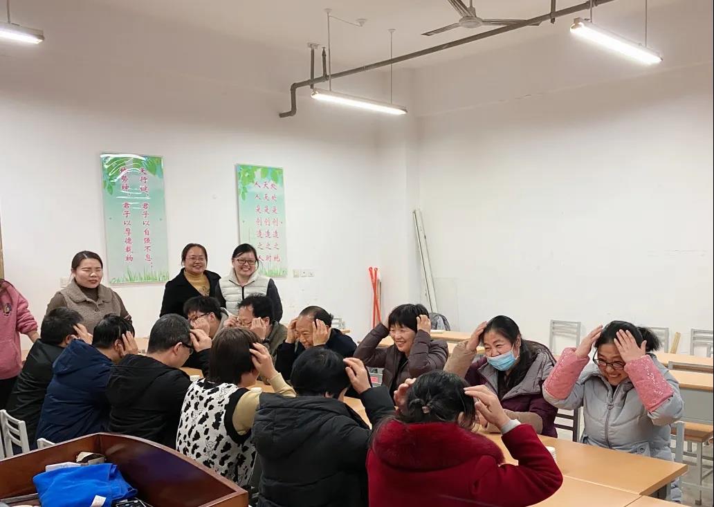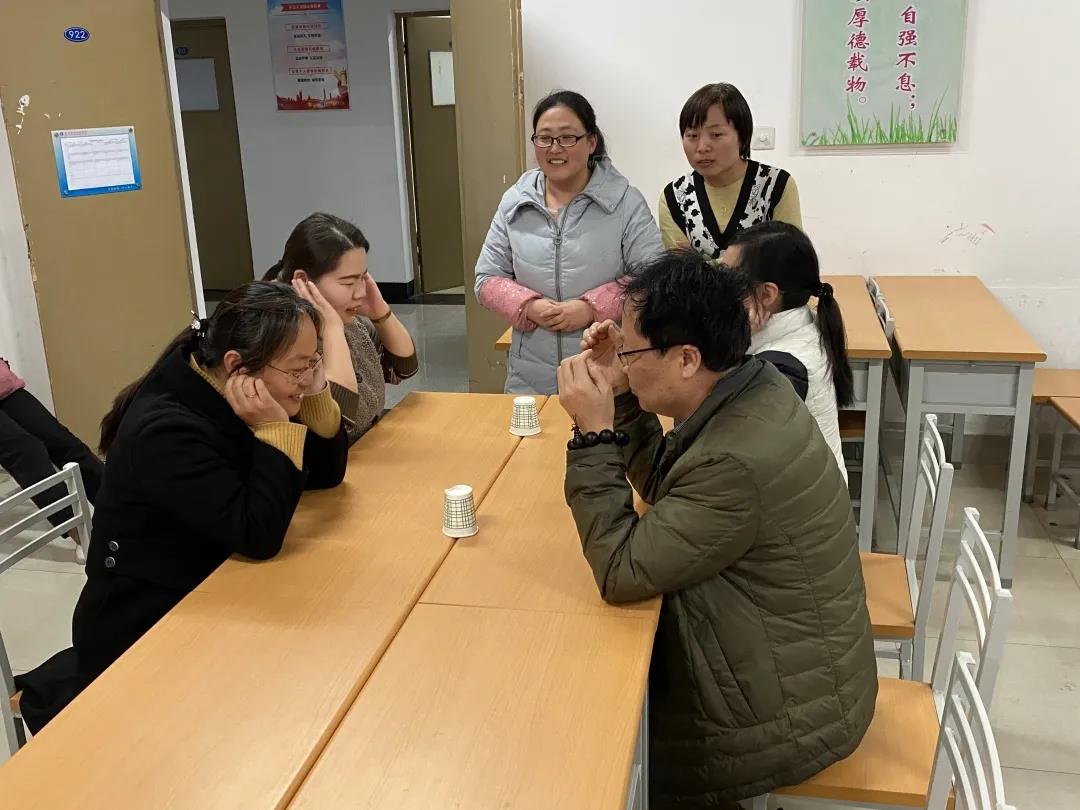 第三场活动是“抢杯子”,教师面对面坐在桌子两侧,根据工作人员的指令做出相应的动作,当工作人员发出抢杯子的指令时,教师迅速抢夺桌子上面的一次性水杯,率先抓住杯子的老师获胜。