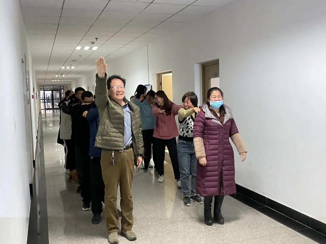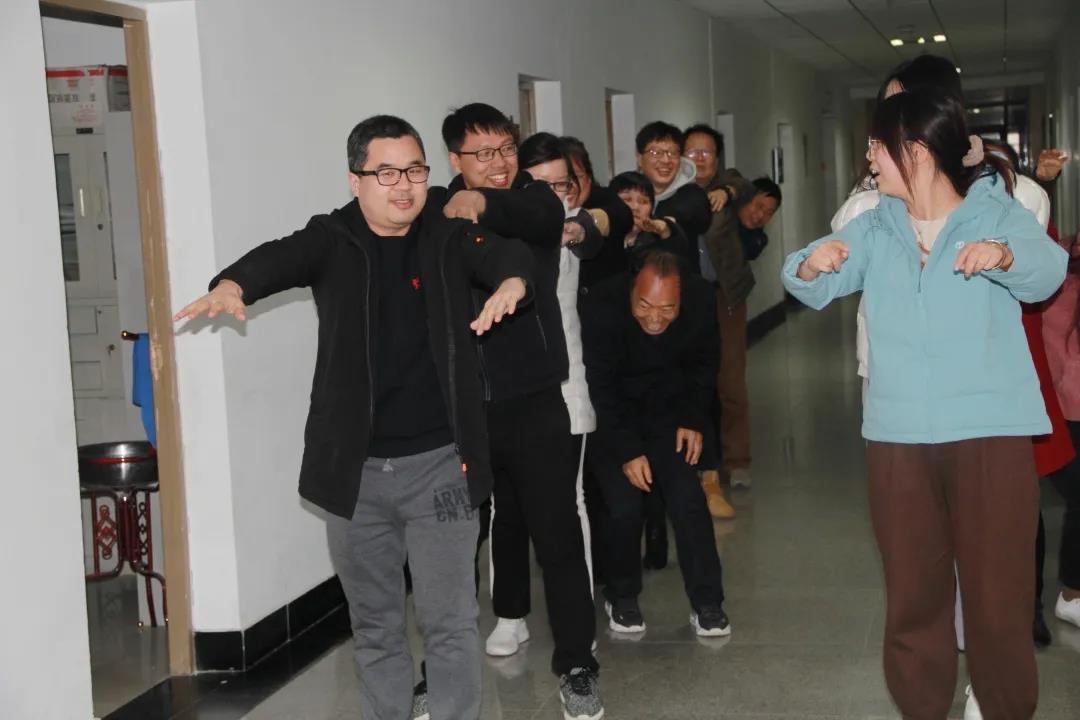 第二场活动是“钻山洞”,教师分为两竖排站好,双手搭在前边教师的肩上,教师从后往前依次以S型穿梭至队列前方,先到达终点的队伍获胜。