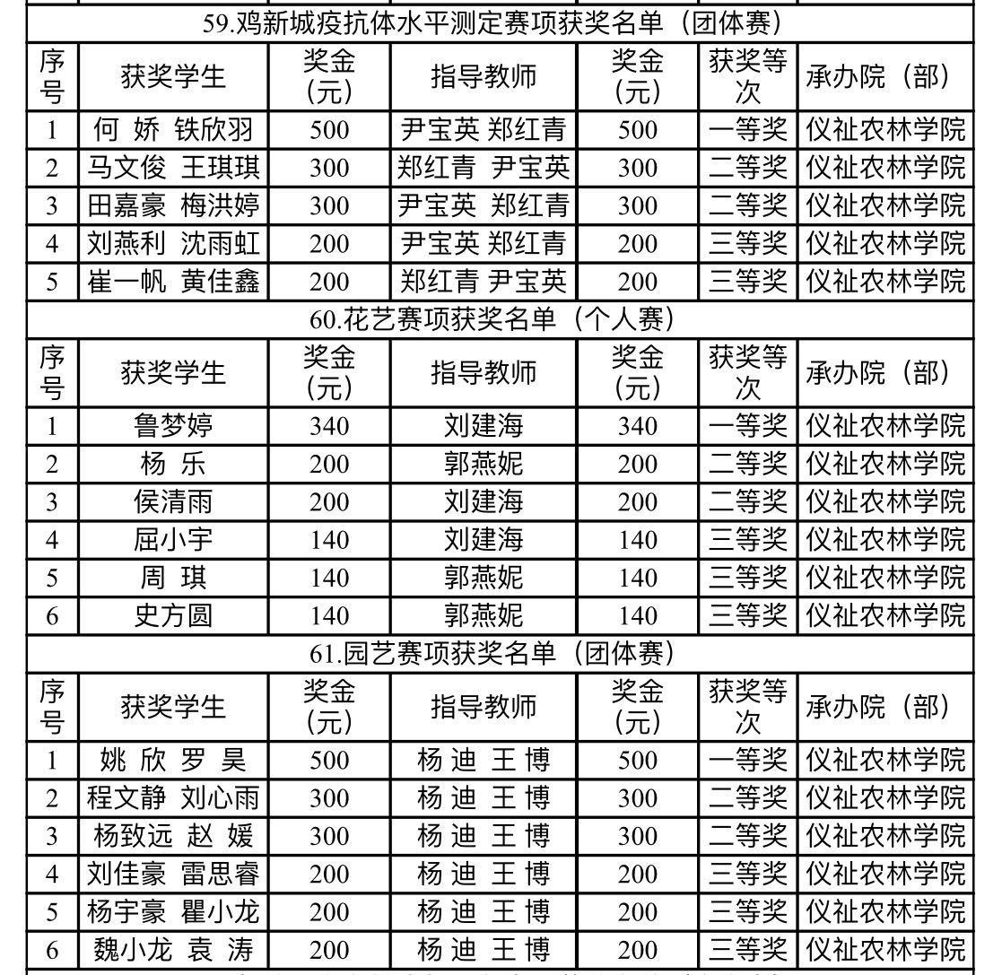 根据公司《关于做好2021年院级技能大赛工作的通知》文件精神,公司于2021年10月举办了院级技能大赛,共有12个院部承办67个赛项比赛,其中个人赛23项,团体赛44项。按照参赛员工竞赛成绩,经院部初审,教务处审核,公司决定对贾怡萱等986名获奖员工和郭佳等230名优秀指导教师予以表彰奖励。公司师生参与了花艺、园艺和鸡新城疫抗体水平测定等三个赛项的比赛,其中何娇等28名员工和尹宝英等6名教师分别获得了不同等次的奖励。