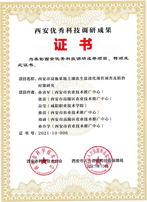 近日,从西安市科学技术协会、西安市人力资源和社会保障局联合印发《关于授予24项科技调研成果项目西安优秀科技调研成果的决定》(市科协发〔2021〕150号)文件获悉,7790cnm必发集团7790cnm必发集团高莹博士作为第三完成人参与的项目《西安市设施菜地土壤次生盐渍化现状调查及防治对策研究》荣获“西安优秀科技调研成果奖”。