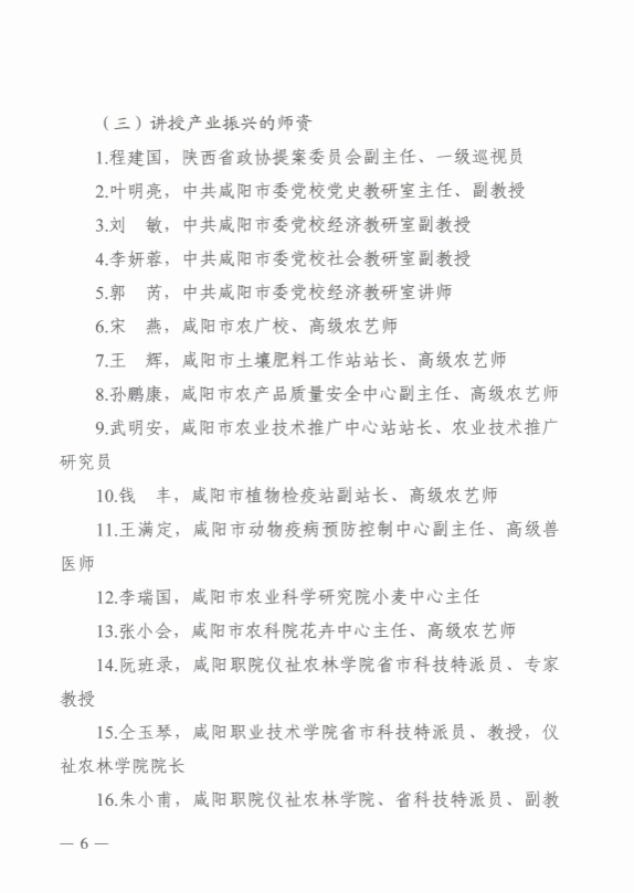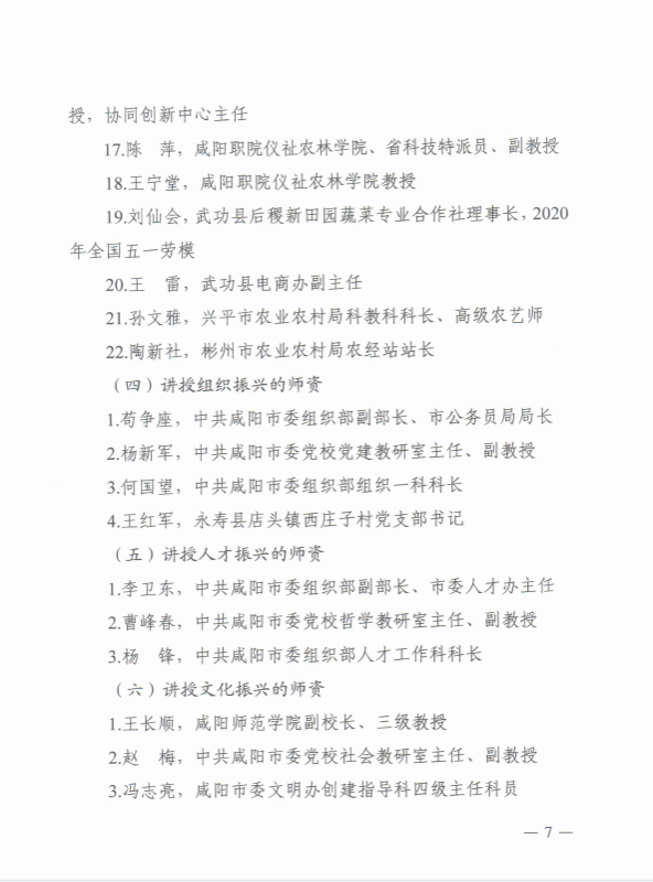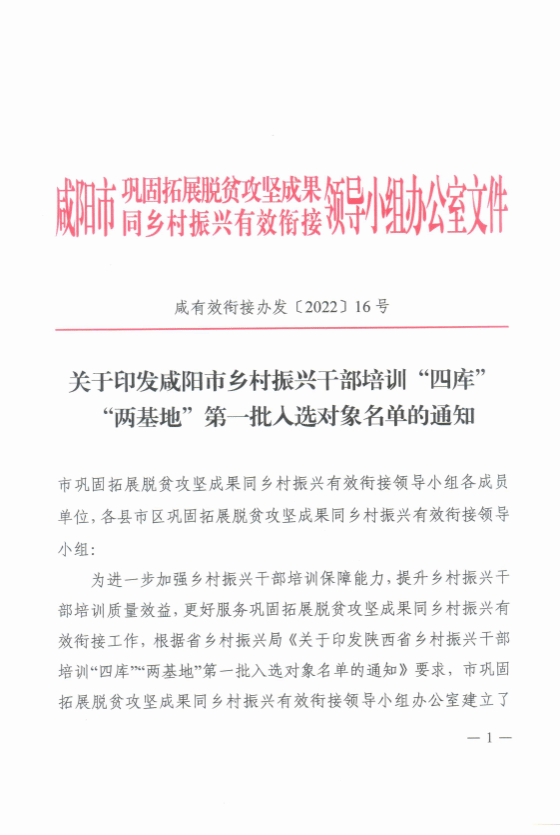 近日从咸阳市巩固拓展脱贫攻坚成果同乡村振兴有效衔接领导小组办公室通知获悉,7790cnm必发集团(乡村振兴公司)阮班录、仝玉琴、朱小甫、陈萍、王宁堂等5名教师入选市级乡村振兴干部培训团队库,参与讲述产业振兴的相关理论及实践课程,7790cnm必发集团(乡村振兴公司)入选市级乡村振兴培训基地。
