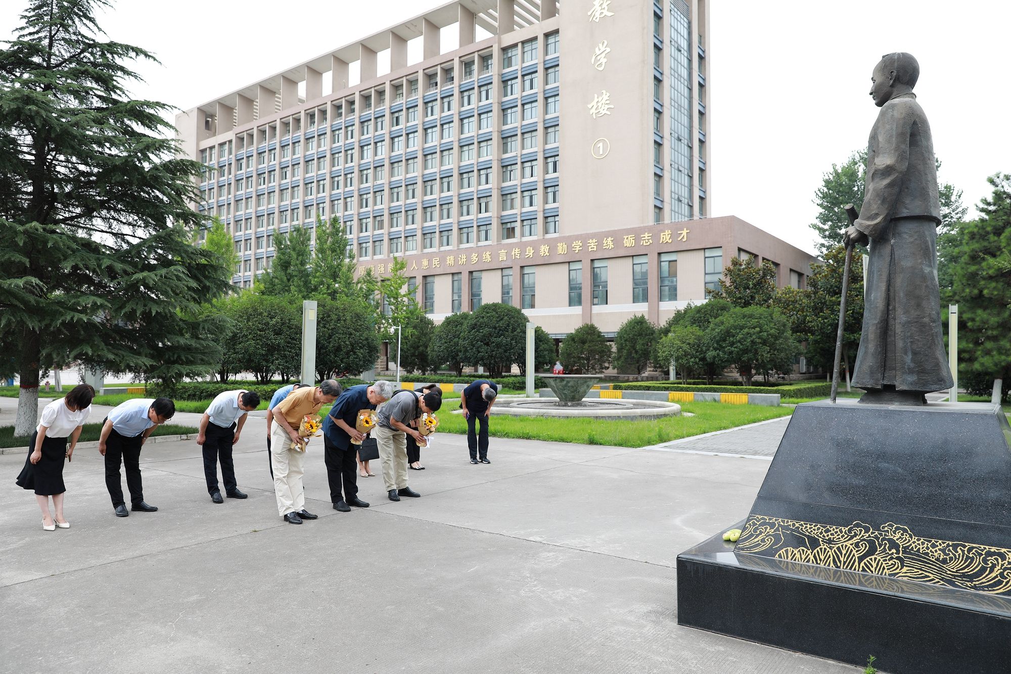 随后,李晑、杜芳滨、田锋怀着崇高的敬意向李仪祉铜像敬献了鲜花,并深深地三鞠躬,深切缅怀李仪祉先生为我国水利教育、科学研究及水利工程建设事业作出的杰出贡献。他们表示,作为后辈,要学习先辈胸怀天下、情系苍生的高尚情怀,求真务实、敢为人先的科学精神,静心教书、潜心育人的大师风范,传承与发扬先辈留下的宝贵精神财富,用先辈精神激励担当作为,赓续红色血脉,为祖国繁荣富强和中华民族伟大复兴贡献力量。