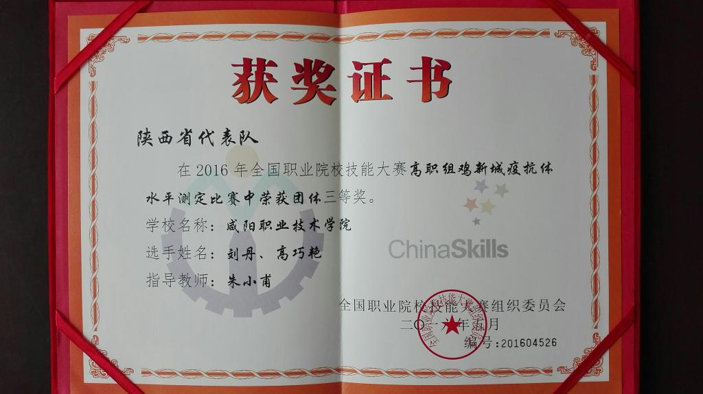 年全国职业院校技能大赛“高职组鸡新城疫抗体水平测定”团体三等奖