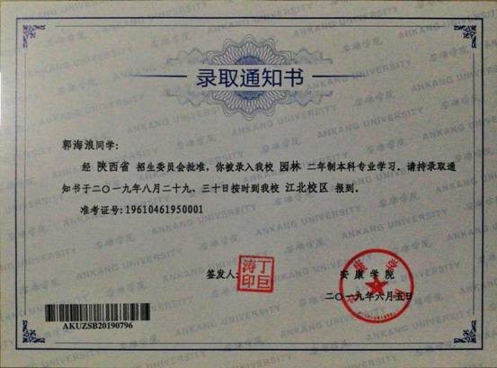 2019年4月13日,对郭海浪来说,是他人生路上一个具有里程碑意义的日子,这一天,他走进了陕西省专升本考试考场,再一次向自己的人生目标发起冲击。他成功了!成绩公布后,郭海浪以超出省定分数线78分的优异成绩被安康公司园林技术专业录取,圆了自己继续深造的求学之梦。